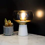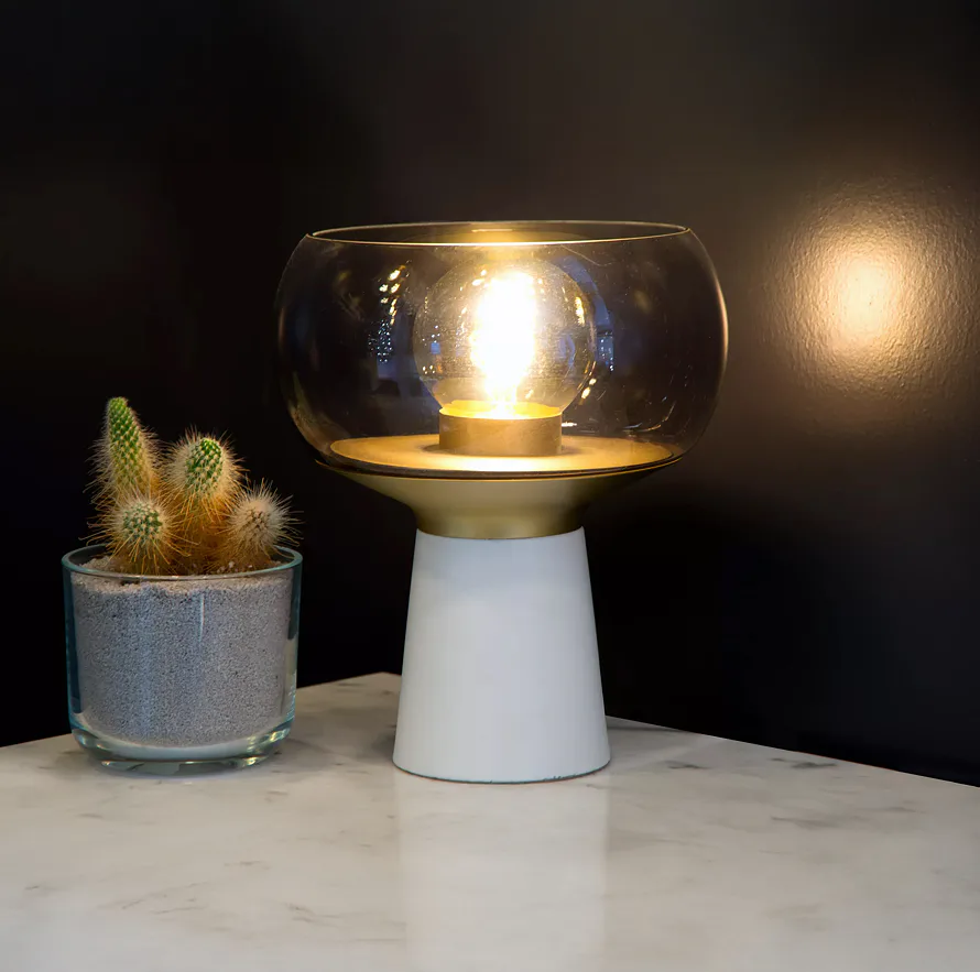 Pohodové chvíle začínají se stolním svítidlem Farris. Atmosféru letního večera a sezení kolem ohniště přenese lampička přímo do vašeho interiéru i v podzimních a zimních dnech. Kombinace bílého kovu a kouřového skla nechávají působit retro designem. Zdroj světla je kvůli půlkruhové kupoli plně viditelný, a tak doporučujeme svítidlo doplnit o designovou dekorativní žárovku.