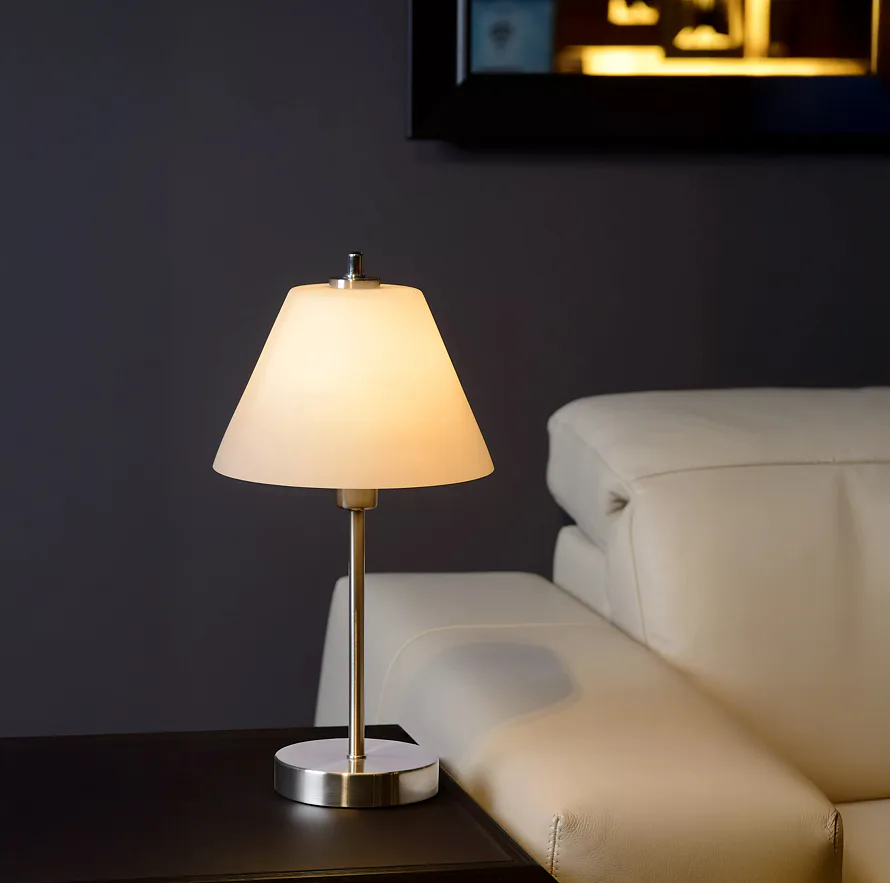 Je totiž vybavena „dotykovým stmívačem“. Když se prstem dotknete podstavce, lampa se rozsvítí, a opakováním tohoto postupu ji můžete stmívat až do požadované úrovně.