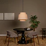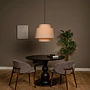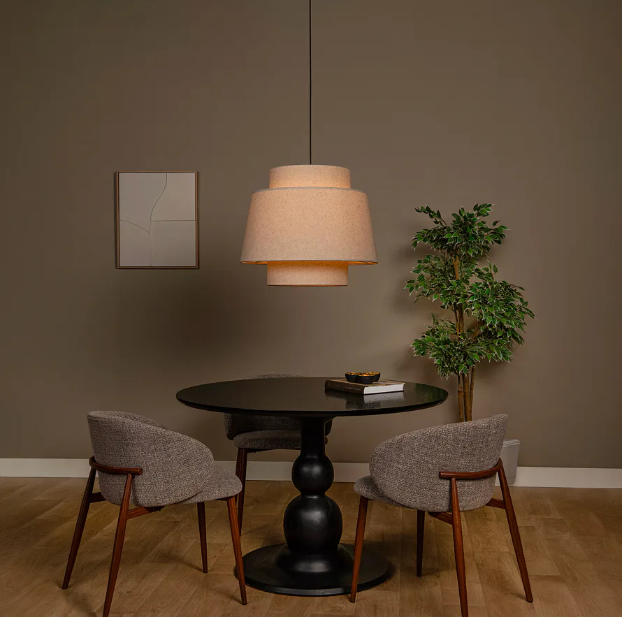 Tento závěsný lustr se chlubí vysoce kvalitním textilním stínidlem. Má vnitřní válcovou strukturu a vnější A-liniovou konstrukci, která vytváří hravý, rozptýlený efekt.