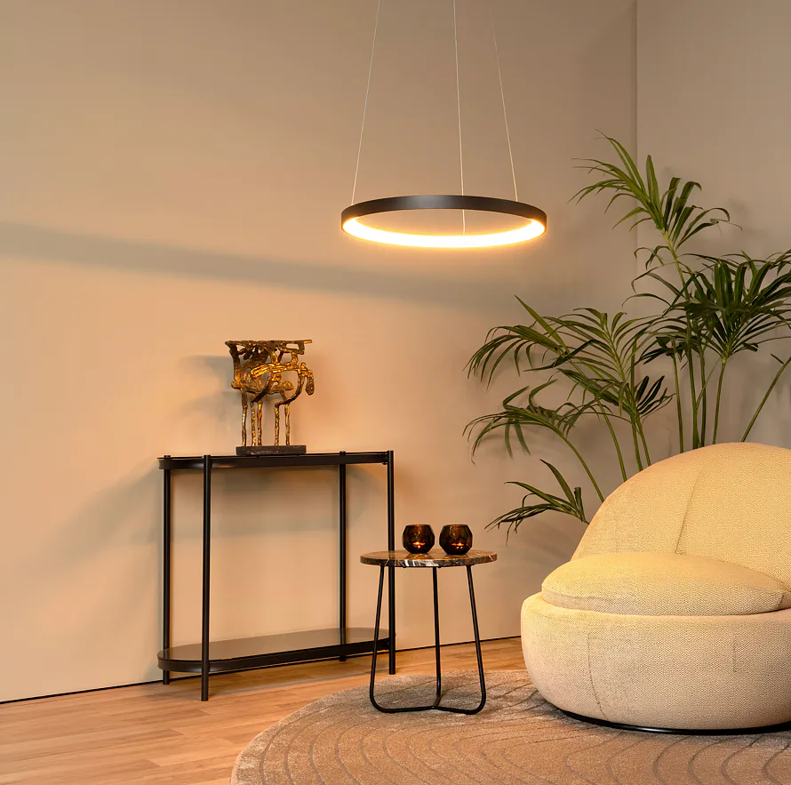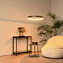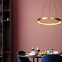 Jeho otevřený kruhový lustr visí z malé kulaté základny na stropě a je zavěšený na třech jemných lankách. Jako celek působí čistě a relaxačně a jeho teplé světlo vytváří ideální atmosféru u stolu. Snadno ho připojíte i k externímu stmívači a můžete si tak sami regulovat intenzitu svícení.