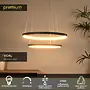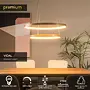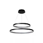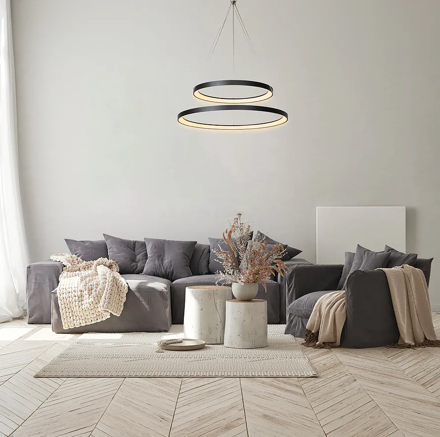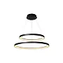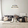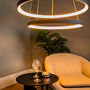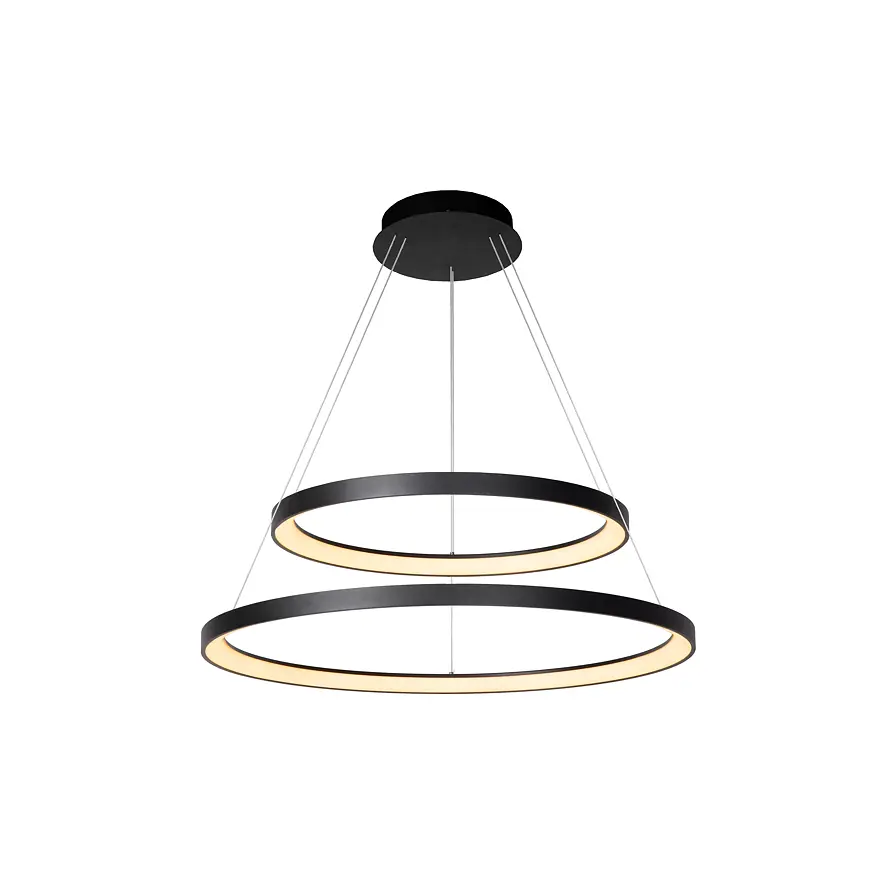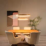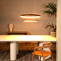 Jeho dva otevřené kruhové lustry visí nad sebou z malé kulaté základny a jsou zavěšené na jemných lankách. Jako celek působí čistě a pohodově a jeho teplé světlo vytváří ideální atmosféru u stolu. Snadno ho připojíte i k externímu stmívači a můžete si tak sami regulovat intenzitu svícení.