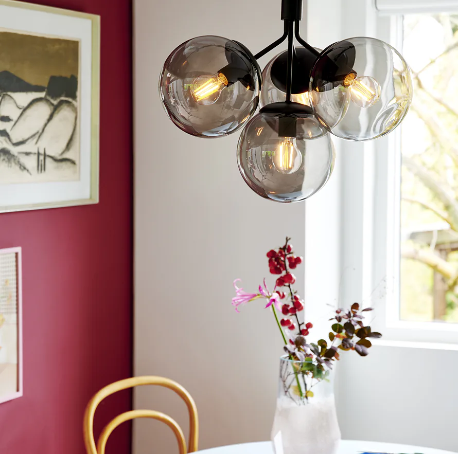 Novinka od Nordluxu Ivona 54 boří představy o klasických lustech. Díky inovativnímu modernímu vzezření Vás lustr nadchne, skládá se ze 4 skleněných koulí, které jsou propojeny do komplexního díla. Můžete si vybrat ze dvou barevných variant světla – černý kov a kouřové sklo tvoří chladný industrální vzhled, oproti tomu opálové sklo v kombinaci s mosazí vytváří elegantní jemný dojem. K černé variantě s kouřovým sklem doporučujeme pořídit některou z našich dekorativních žárovek.