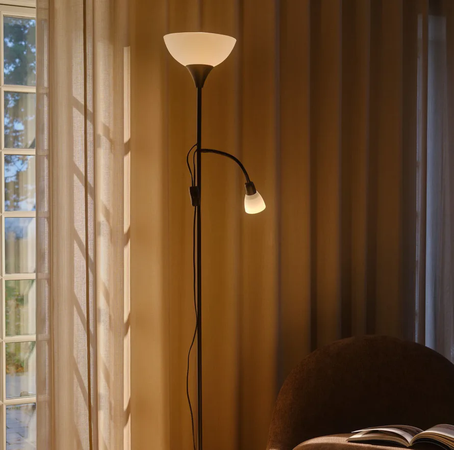 Tato elegantní stojací lampa kombinuje velké opálové stínidlo s menším flexibilním světlem na boku. Ideálně se hodí k pohovce nebo do čtecího koutku. Hlavní světlo rozjasní místnost, zatímco nastavitelné rameno vytvoří soustředěné světlo na čtení i práci.