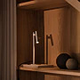 Minimalistická, vertikální silueta je zakončena saténovým chromem – teplou, kartáčovanou povrchovou úpravou, která dodává industriálnímu vzhledu jemnou měkkost.