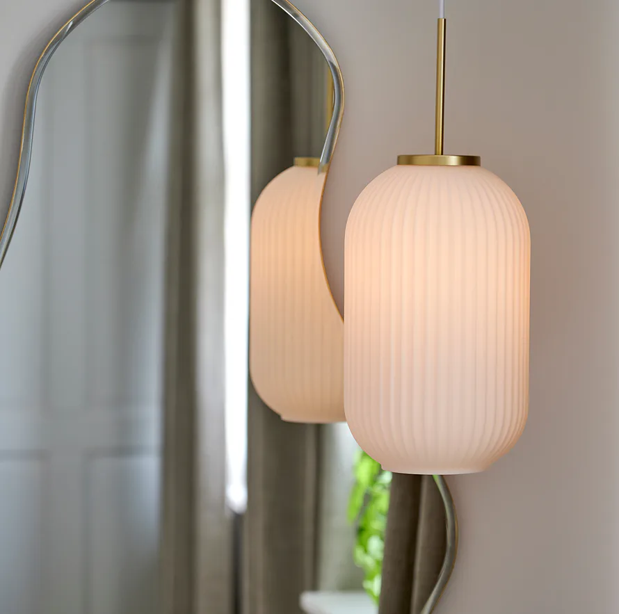 Milovali jste v dětství lampiony? Vyberte si Milford od Nordluxu. Originální závěsné svítidlo z bílého opálového skla se skládaným vzhledem můžete mít v kulaté, anebo podlouhlé variantě. Díky mosazným detailům dodá punc jedinečnosti Vašemu obývacímu pokoji nebo jídelně.