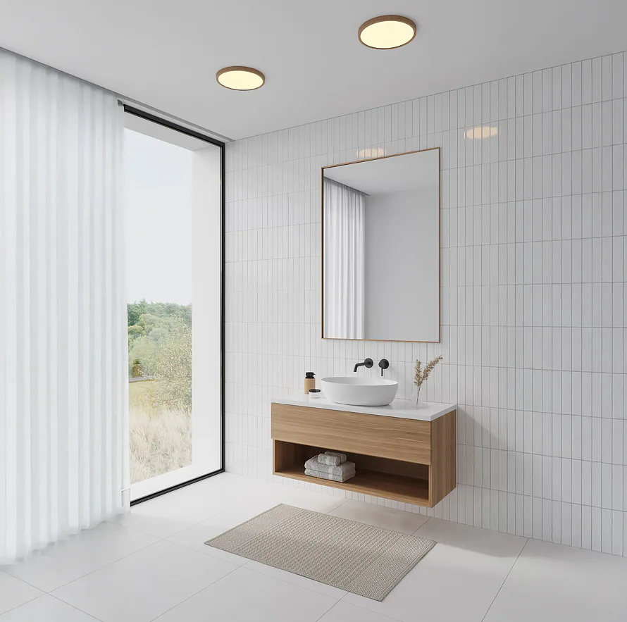 Jednoduché kruhové stropné svietidlo Oja 29 od spoločnosti Nordlux v ultratenkom prevedení s vysokou ochranou je vhodné do vlhkých priestorov, ako je napríklad kúpeľňa. Poskytuje príjemné svetlo s jemným efektom podsvietenia, ktoré možno stlmiť zakúpením externého nástenného stmievača. Svietidlo je k dispozícii v drevenom vyhotovení.