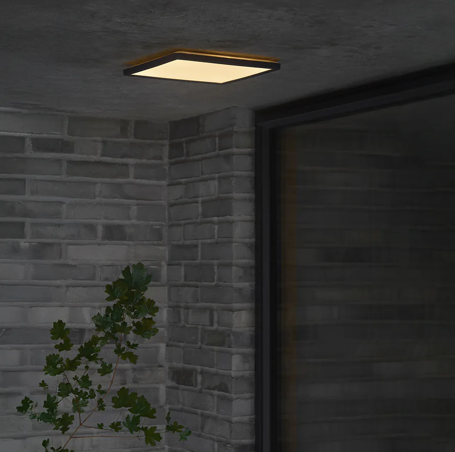 Oja je ultra tenké venkovní stropní svítidlo s elegantním, minimalistickým designem a vysokým stupněm krytí (IP54).