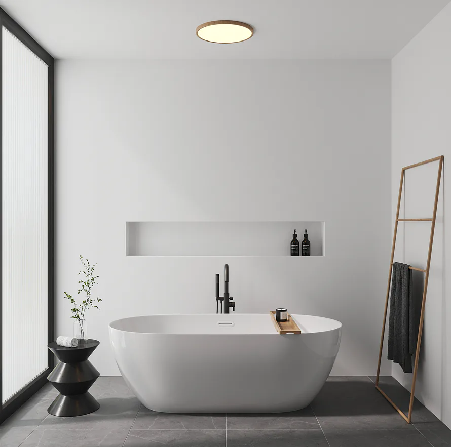 Jednoduché kruhové stropní svítidlo Oja 42 od Nordluxu v ultra tenkém designu s vysokým krytí je vhodné do vlhkých prostor jako je koupelna. Poskytuje příjemné světlo s jemným efektem podsvícení, které je možné stmívat při zakoupení externího nástěnného stmívače. Svítidlo je dostupné ve vzhledu dřeva.