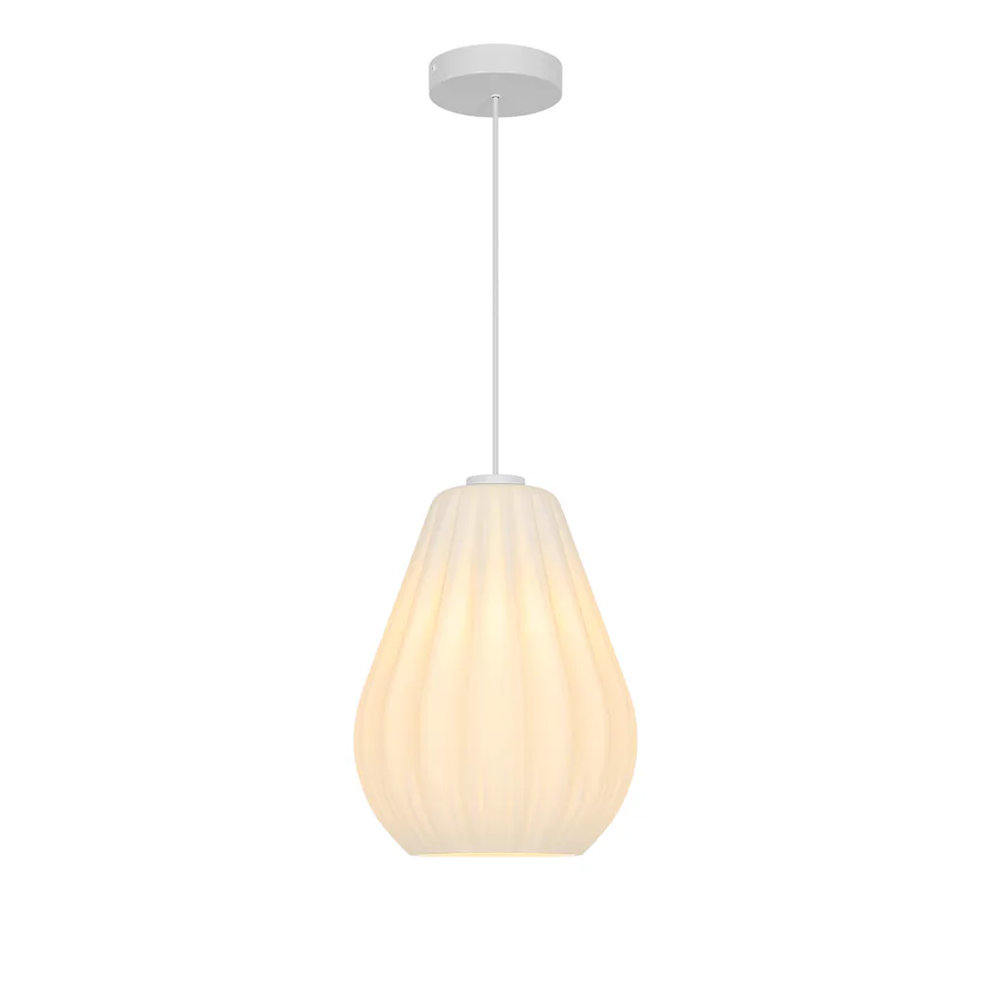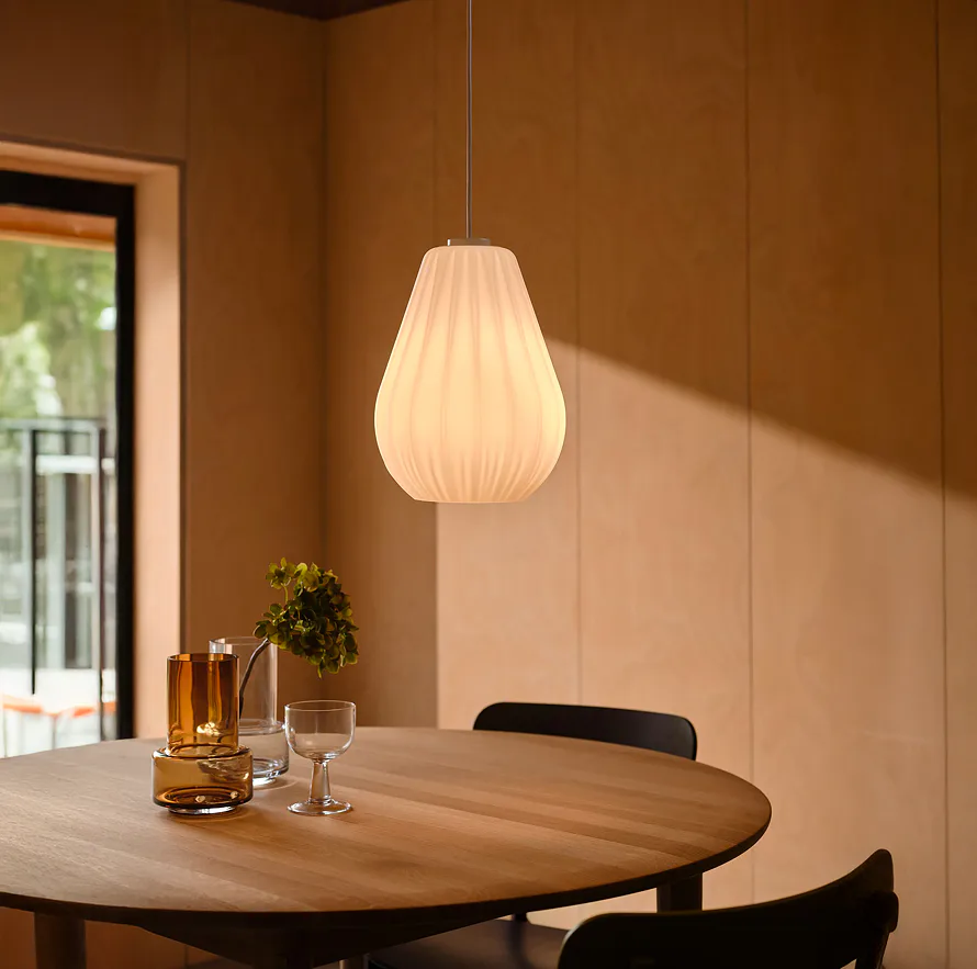 Stínidlo z matného opálového skla poskytuje měkké, rozptýlené světlo, které vytváří teplou a příjemnou atmosféru.