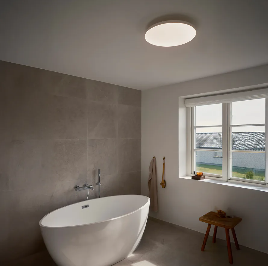 Jednoduché a elegantní stropní svítidlo Serenova má krytí IP65, takže je ideální do koupelen.